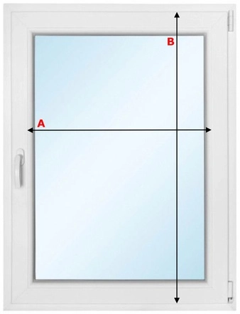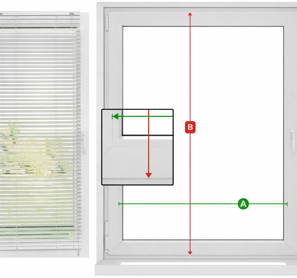 Wysokość żaluzji B to — wysokość całkowita skrzydła okna minus 2 cm.
